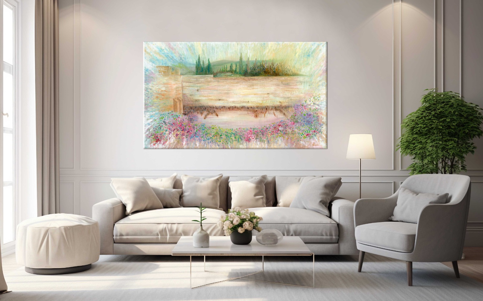 “הכותל” הוא ציור המבטא תחושת אחדות וחיבור עמוק. במרכזו נראים גברים, נשים וילדים העומדים יחד מול האבנים העתיקות — כל דמות עם צבעים וצורה משלה, אך כולן פונות אל אותו מוקד קדוש.